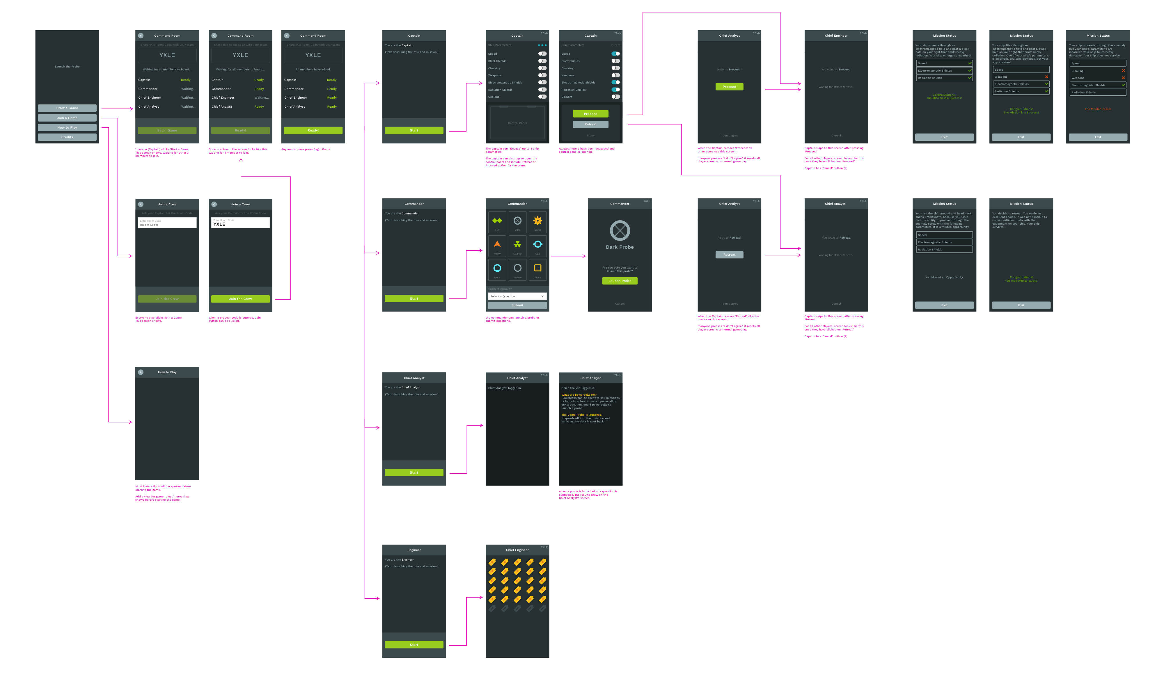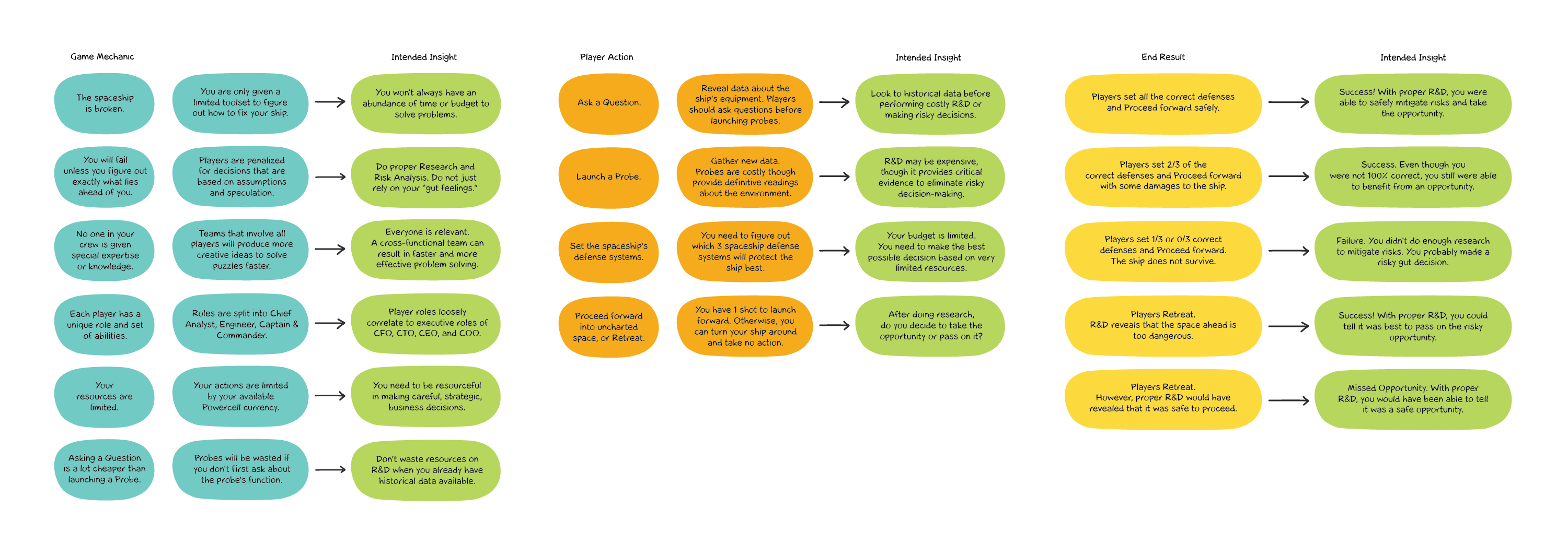 Organizing all of our ideas, we mapped key game mechanics, player actions, and all possible win/lose scenarios to potential player insights.