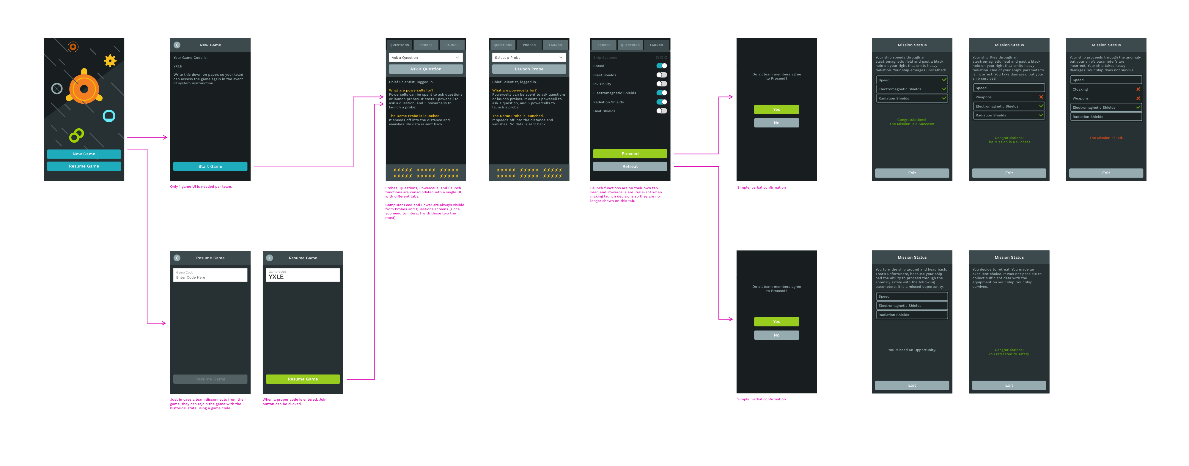 Mockups showing the player actions split into different game UI screens.